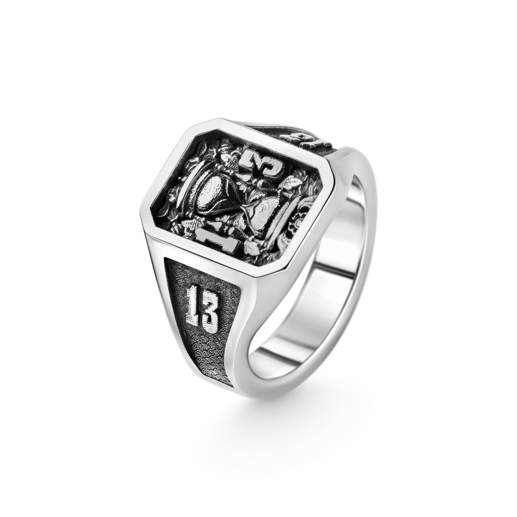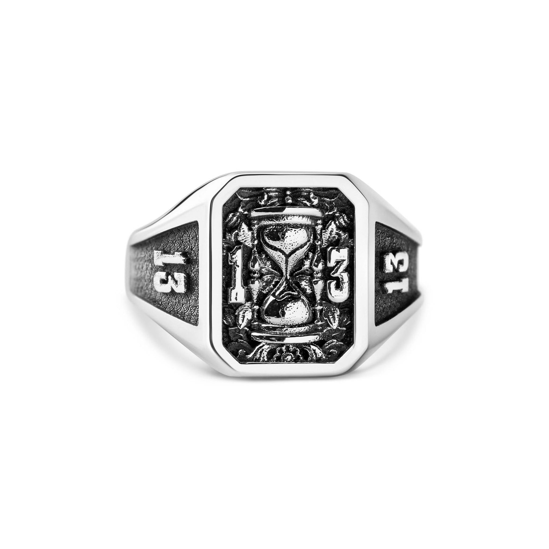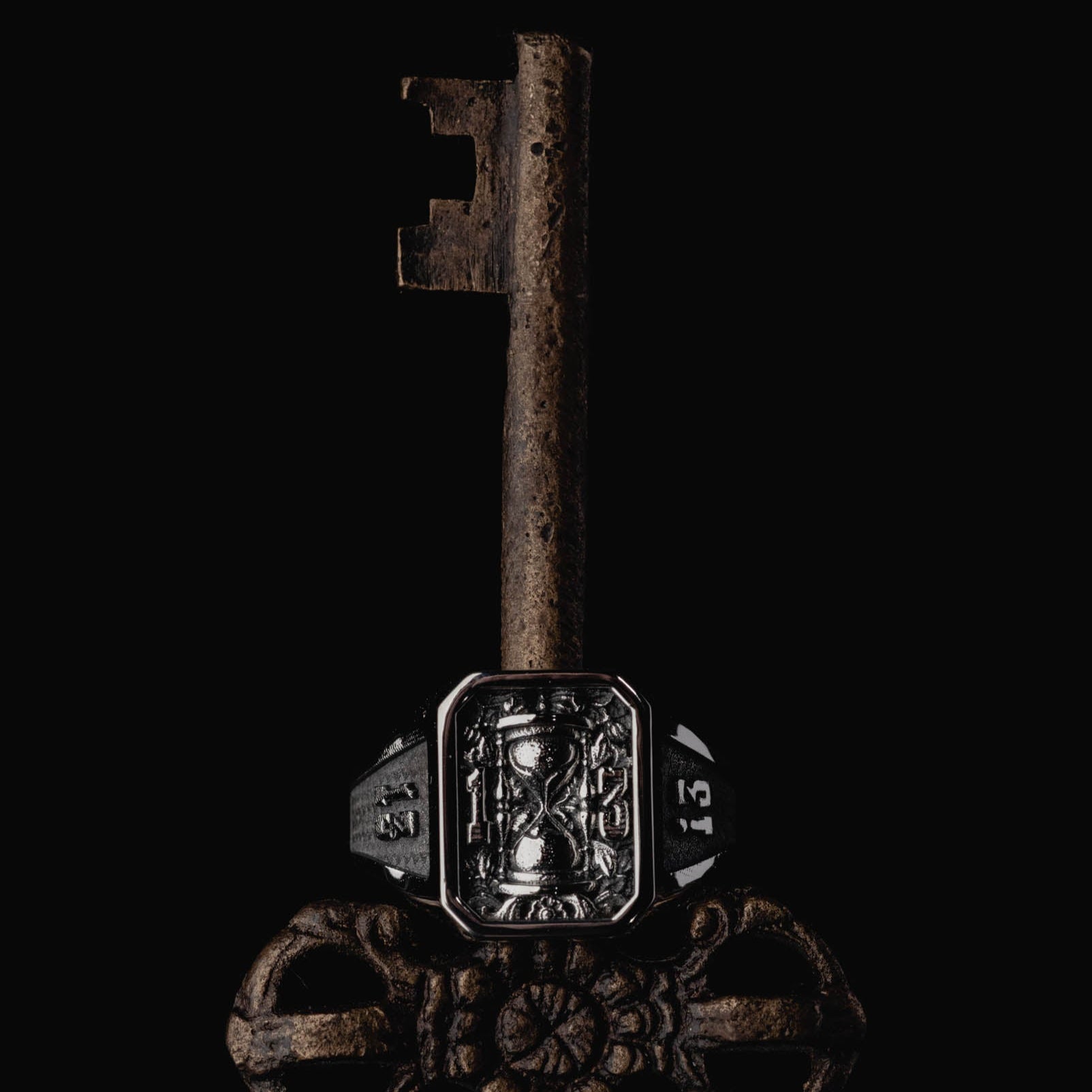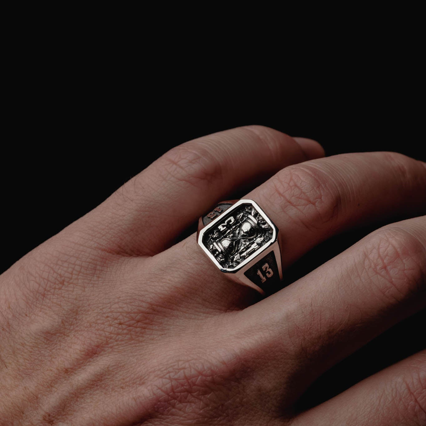 The 13th Grain Signet is a tribute to that impossible second. Set inside a bold octagonal frame, a reversed hourglass stands between carved numerals 1 and 3, flanked by 13s on each shoulder like a branded omen. Ornate, oxidised floral engravings wrap the ring — blooming and rotting at once.